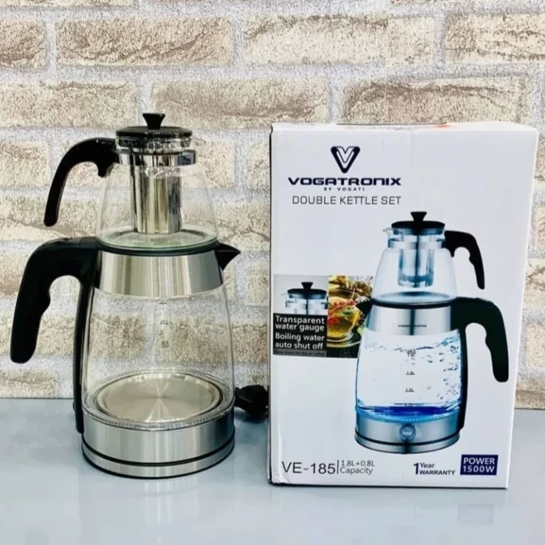 1500 وات . حجم کتری 1.8 لیتر و حجم قوری 1 لیتر ، دارای قطع کن خودکار و دکمه گرمکن میباشد